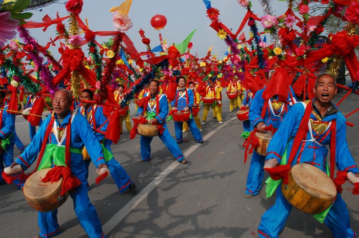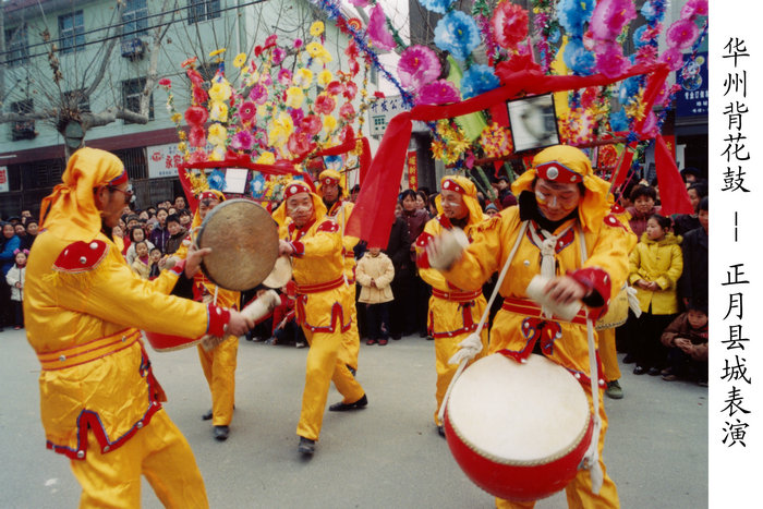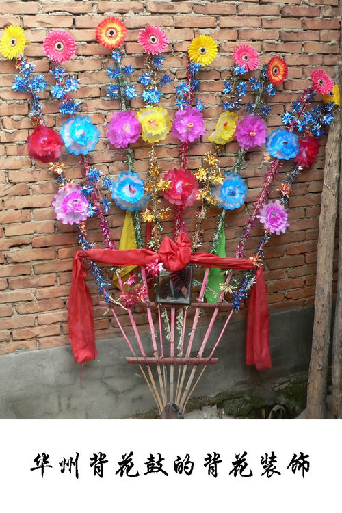 华州背花鼓,流行于华县北部下庙镇的东甘、西甘、康甘村一带,它源自祈雨祭神活动仪式中的民间祭祀鼓舞,从汉代开始以舞蹈的形式流传至今。因当地方言称“跳”为“蹩”,故该舞又称为“蹩鼓子”。表演者均为青年男性,通常由30人组成。背花以五根长竹篾为架,上扎五色大纸花、花旗、假柳条及圆镜红绸,因这种巨型扇面五彩舞饰而称此舞蹈为背花鼓。表演者背花挎鼓,双手击鼓而舞。舞姿粗犷原始,以跳为主要动作。背花随着舞者的跳动和舞姿的变化,如孔雀开屏,似旌旗飘荡。配以鼓声、锣声和舞者豪放的呼喊声,声威雄壮,有排山倒海之势,现场气氛震撼而狂热。华州背花鼓是研究古代祭祀舞蹈的珍贵活体资料,华州背花鼓2007年被列入第一批陕西省非物质文化遗产名录。