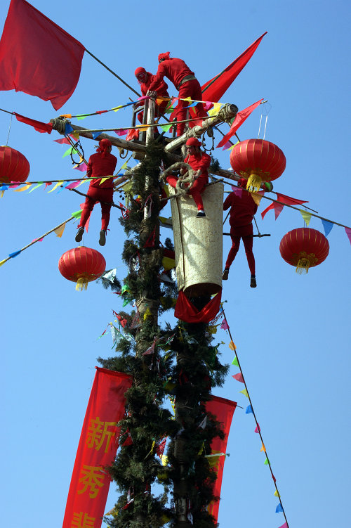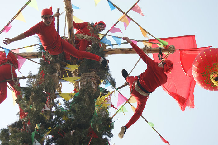 澄城县雷家洼乡堡城村“上刀山”特技始创于民国初年,由该村焦刘宝、焦彩茂二位老人根据民间杂技“扶老杆”改进而成。“刀山以捆扎几节木棍为帮、以若干铡刀为格、搭成20多米的高杆梯。表演时六名勇士上刀山,即在刀与刀的空档跃身而过,随即登杆表演。其主要特征:一是构架悬。以砂瓢做底座,承受两吨之重,上有双十字木椽,架于高空,无风也有一米左右的摆幅。二是表演险而富有美感。双杆高竖,红旗翻飞,铃声传响,刀光映日,表演者身缠柏枝,于刀丛中各显身手。表演溜梢棍、倒挂脚面、侧身摘星、蝎子编尾等绝技绝艺,使观者心惊目眩。澄城表演特技“上刀山”2009年被列入第二批陕西省非物质文化遗产名录。