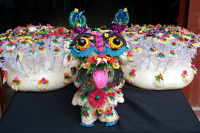 澄城面花是当地民间的一种手工艺术品,也是当地民众年节往来馈赠亲友的传统礼品。面花的主料小麦面粉,辅料有各种豆类、核桃、红枣、鸡蛋等。由农妇通过和面、加色,运用捏、修、剪等手法,做成人物、动物等多种造型,上笼蒸制后再经过插花等工序制作而成。澄城面花的造型分为三大类:一是简洁生动、类似浮雕的贴花馍;二是大胆夸张、造型独特的变体馍;三是绚丽多彩、富丽堂皇的插花馍。澄城面花最有特色的是丧葬礼馍,民间常说的白事,以白示孝,但蒸的花馍却是花花绿绿,色彩鲜艳,借以表达对逝者灵魂升天的祈祷,面花上的戏剧人物也有陪葬的意思,反映了独特的民间信仰。