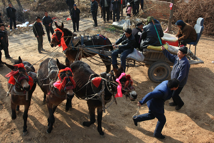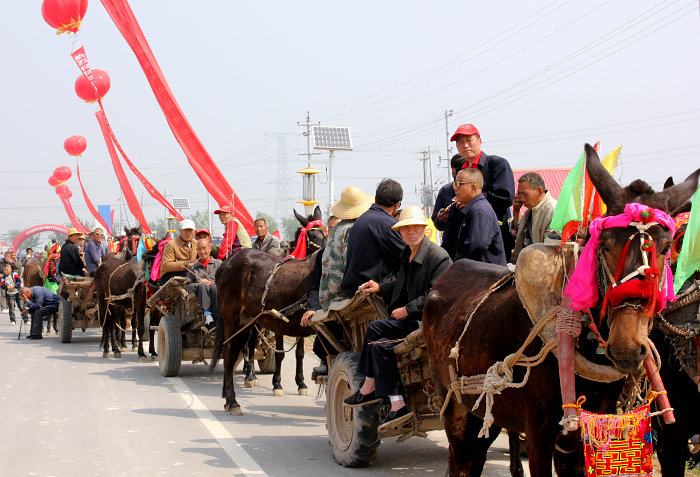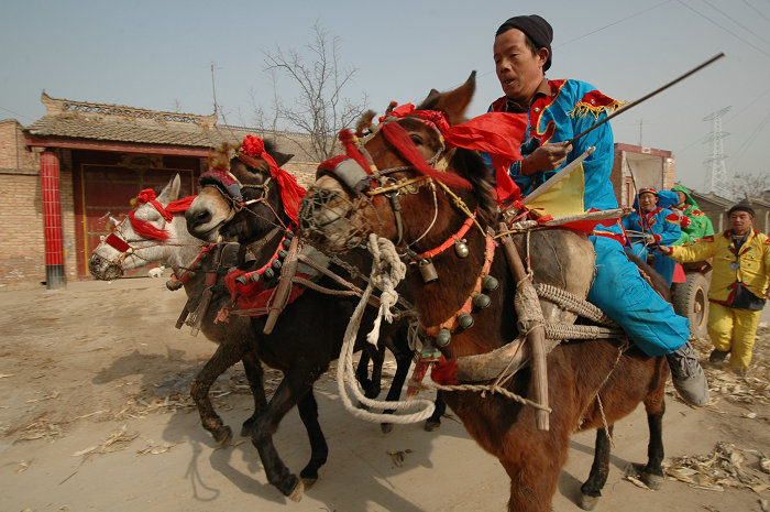 跑骡车是民间社火的一种表现形式,已有上千年历史,主要流传于临渭区的孝义、吝店、南师、故市、官道、下吉、田市等乡镇,其中以故市一带的表演最为驰名。一挂骡车一般由四骡十人组成。骡分辕骡、首套、中套、外稍,每辆车都有4个吆车的(1个吆骡子的,1个坐辕的,2个马童),另有6个敲锣鼓的,他们身着鲜艳的对襟民族服装,其中1人以击马锣作指挥,另有1人敲鼓,4人敲饶。“跑骡车”均为多车连挂,成双成对,取祥和吉利之义。表演开始,吆骡车人鞭子“吧嗒”一甩,骡子奋蹄在在大道上狂奔,此时,锣鼓声、马嘶声、铜铃声和成千上万观众的呼声喝彩声响成一片,如急风暴雨、山呼海啸。到达目的地,骡车会泊在一片平坦的场地上表演“璞鸽踅窝”等绝活,由动转静,静中有动,锣鼓表演整齐而威武,场面十分壮观。跑骡车2009年被列入第二批陕西省非物质文化遗产名录。