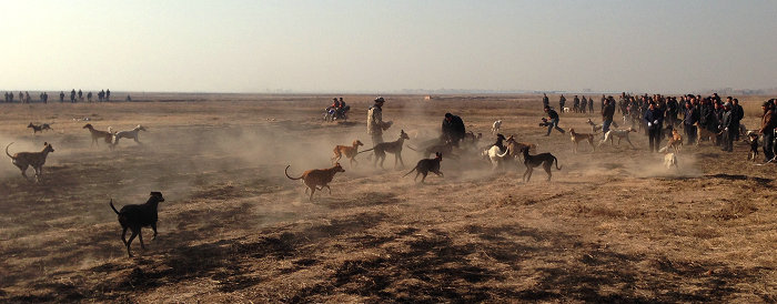 渭北细狗撵兔竞技是蒲城等地农闲时的一项传统的民俗活动,它起源于原始社会的集体狩猎,汉唐时期以皇家围猎的形式出现,五代以后逐渐发展到现在的模式。撵兔之细狗:“黄瓜嘴,羊鼻梁,四蹄如蒜;腰似弓,腿似箭,耳垂尾卷。”动作敏捷、凶猛善咬,非常适合在平原地带奔跑追逐。渭北撵兔日主要安排在元宵、端午、腊八等节日。节日当天,蒲城当地及外地细狗爱好者为自己的爱犬穿衣挂彩,在平原上一字排开,地毯式向前搜索。一旦发现野兔的踪迹,指挥者(狗司令)一声唿哨,众人大呼“快撵!”狗就箭一样射了出去。各家狗你争我夺,厮杀拼搏,狗撵兔,人撵狗,加上成千上万看热闹的群众,山呼海啸,场面壮观。农闲时节的细狗撵兔,既活跃了生活,又锻炼了身体,使大家释放了情绪,增强了团结,是一项很有益的民间活动。同时对减少兽害、增产增收、生态和谐也有积极意义。渭北细狗撵兔竞技2009年被列入第二批陕西省非物质文化遗产名录。