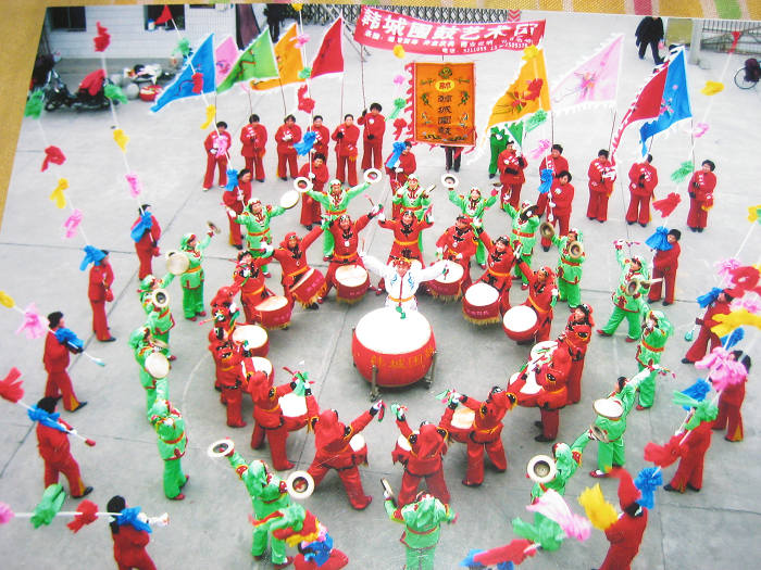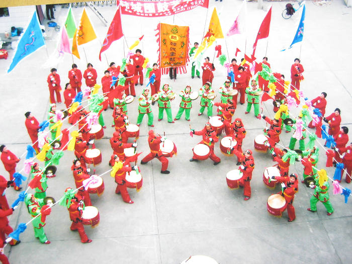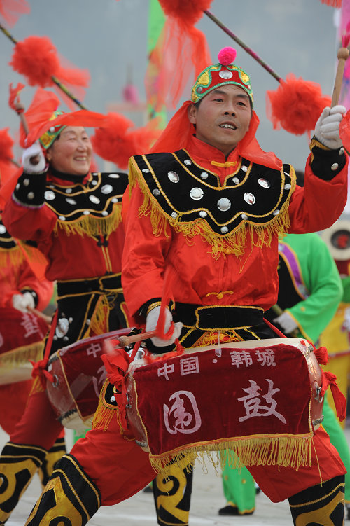 韩城围鼓的队列可分为两种:1、行进队列。有单项、单鼓相对型;双项、双鼓相对型。与行进锣鼓的节奏紧密配合。2、围场队列。有大围场、小围场和四季花型(牡丹、莲花、菊花、梅花)围场。分别与不同锣鼓曲牌相配合。如“大围场”用《对鼓》、《悬锤》等曲牌,“牡丹型”用《紧三锤》、《打细乐》等曲牌。韩城围鼓演出时场面宏大(七个阵营组成,总人数可达200余人),节奏多变,切分音、休止符多处使用,鼓、钹声和谐悦耳。现整理出的围鼓曲谱有《紧三锤》、《定疙巴》、《摘豆角》、《扑鸽暖窝》、《肚内痛》等十章。韩城围鼓2011年被列入第三批陕西省非物质文化遗产名录。