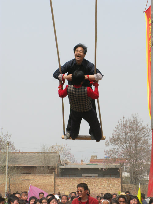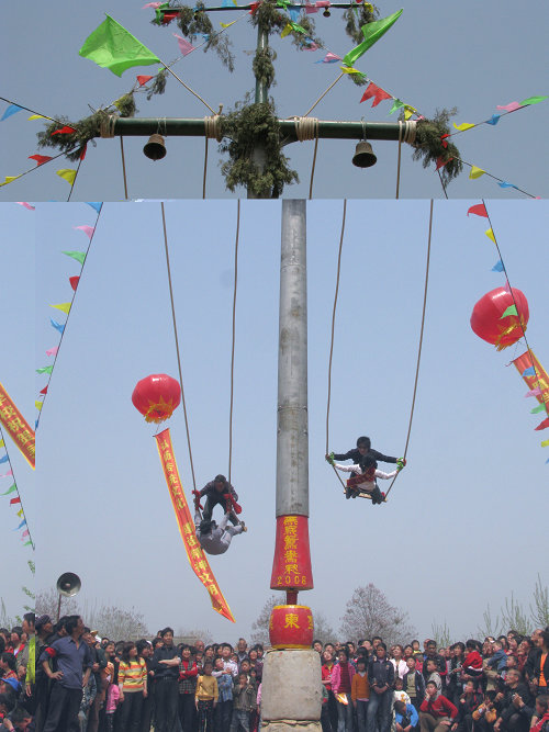 无底鸳鸯秋千起于富平县美原镇吴东村。清明时节,渭北干旱,先辈们为了祈雨,在村中空地树起一根十几米高的木杆,寄寓“一杆戳破天,甘露降人间”之意。秋千便是从这种祈雨活动中衍生而来的,最初是在祈雨的木杆上结一根绳,双手抓绳而荡,后来逐渐演化为两根绳加踏板的秋千。清嘉庆年间,吴东村一刘姓艺人引进了一种设计惊险巧妙的秋千,恰有一对青年男女由对打秋千而结为连理,据此人们便称这种秋千为“无底鸳鸯秋千”。吴东无底鸳鸯秋千是在两到三个碌碡上放一鼓石,鼓石上面立一根五六米高的立柱,在立柱顶端固定一根横梁,两边各吊一个秋千。为了美观,人们还在秋千两边各挂一个大铜铃,并在上面悬挂若干小铃,配衬松柏枝叶和彩旗。荡秋千可以分为单人表演、男女对打、两人竞打、站打、坐打等多种形式。表演时人如飞燕穿梭,周围彩旗飘舞,场面壮观。吴东无底鸳鸯秋千2011年被列入第三批陕西省非物质文化遗产名录。