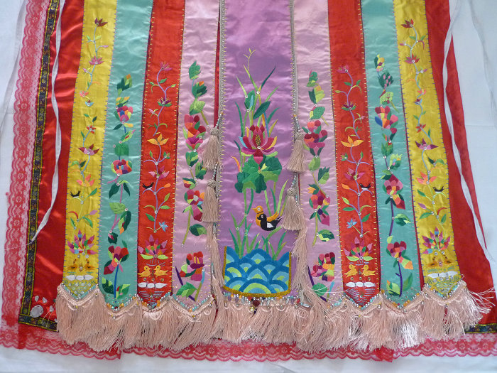 大荔刺绣历史悠久,现主要分布于县境内高明、朝邑、石槽、八鱼等乡镇。在漫长的发展过程中,形成了以洛河为界南北两种截然不同的艺术风格。洛南一路朴拙粗犷、浑厚阳刚,多以民间的虎崇拜为主题,代表作品有“虎头帽”、“虎头枕”等;洛北一路精细隽永、寓意含蓄,多运用动植物图案表现多子多福、富贵、长寿等主题,代表作品有“一蔓葫芦一蔓瓜”、“胖娃坐莲”、“凤凰戏牡丹”等。大荔刺绣针法齐全,在花朵和动物眉毛等细部描写时多使用绷花技法,显得图案饱满、精神十足。大荔刺绣品种百余,针工细腻清晰,色彩鲜艳,使用广泛,与生活息息相关,现在多用作小孩服饰、舞蹈道具和收藏品。大荔刺绣2011年被列入第三批陕西省非物质文化遗产名录。