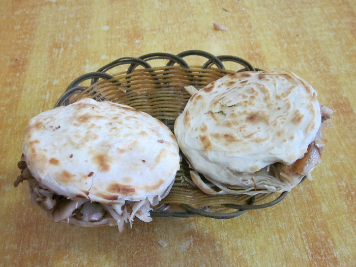 潼关肉夹馍主要分布于潼关、渭南等地,从它添加猪板油来使馍酥软的工艺来看,可以追溯到东汉时的“胡饼”,距今应有1800多年历史。潼关肉夹馍制作技艺分为卤肉、和面、打饼、烤制和夹馍五道工序。卤肉是将五花肉洗净后切成块,放在装有特制配料的卤锅内浸泡、炖熟。和面是将小麦面粉加温水、碱面和猪油手工搅拌,和成面团,温水的凉热和原料配比全靠艺人经验掌握。打饼是将面团先搓成条,抹上一遍猪油后卷成油饼,用木棒进行有节奏地反复敲击,直到猪油层层渗入面团。烤制是将打好的油饼上鏊烘烤,待花色均匀,饼泛黄色时取出,刚出炉的千层烧饼皮薄松脆,咬一口,掉渣烫嘴,口感极佳。夹馍是将烧饼用刀从饼厚度中间切成两扇,夹卤碎肉吃。潼关肉夹馍馍酥肉香,具有悠久的饮食制作传统和鲜明的东府特色。陕西潼关肉夹馍制作技艺2011年被列入第三批陕西省非物质文化遗产名录。