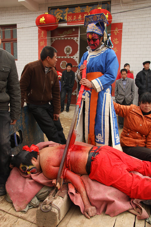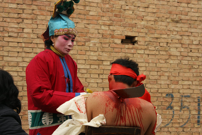 大荔血故事分布于县境内石槽、户家、羌白等乡镇,是民间社火芯子中的一种特殊形式。它的起源无从考证,多取材于传统武戏、神鬼传说,如:《铡美案》《小鬼推磨》《锯裂分身》等,把铡头、挖眼、剖腹等血淋淋的场景表现出来,教育人们汲取教训,多行善事。大荔血故事妆扮时有严格的要求:一、要在保密隐蔽的环境里妆扮;二、妆扮的把式先一天净身沐浴,隔离于社火妆扮场内,不得同女人说话,不得行房事;三、妆扮当天鸡鸣之前,妆扮把式在特定的地方,先将猪羊用酒馍食醉,然后秘密宰杀,取鲜血、内脏备用;四、妆扮演员选定化妆部位,要用酒清洗,扮好后,还要递上三、五杯酒,饮后方可上芯子出游;五、妆扮者都是本命年人,据说他们见了刀、枪等可避凶险,平安度过本命年;六、扮血故事的前一天,必须祭风神,抬出一两台芯子响鞭、敬神,以求活动平安。大荔血故事寓教于乐,是人们惩恶扬善、宣泄感情的载体,具有极高传承价值。大荔血故事2011年被列入第三批陕西省非物质文化遗产名录。