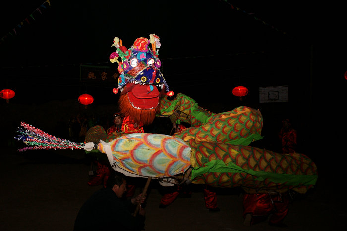 耍龙灯是澄城县韦庄镇魏家斜村的一种民间舞蹈艺术。据《澄城县志》记载,该村的魏姓村民系唐初郑国公魏征的后代。相传魏征私访从铁镰山(韦庄镇)顺一龙状胡同斜踩而来,眼前水土肥沃却荒芜人烟,遂让自己家族三户人家迁来,耕食繁衍,此地即名魏家斜。魏姓家族为追述祖先的功绩,选在每年正月二十三耍龙灯,兼有祈雨之意。龙灯用竹片做骨架,木杖做龙拐,用棉絮牛油做蜡烛放在里面,外面裹上彩绘土布。表演中,蛟龙表现出平飞、仰追、俯冲、盘卧、翻滚各种形态,整个过程活灵活现,使用锣鼓伴奏,场面十分壮观。耍龙灯举行三天,最后一天午夜举行斩龙仪式,烧龙须、断龙头、脱龙衣,由敬龙娱龙转为恐吓龙王,以求得春耕之前的一场透雨,保当年庄稼丰收。在魏家斜素有“龙灯不出村”的说法,耍龙灯是一项独具特色的民间文化遗产,也是一个亟待保护的项目。耍龙灯2008年被列入第一批渭南市非物质文化遗产名录。