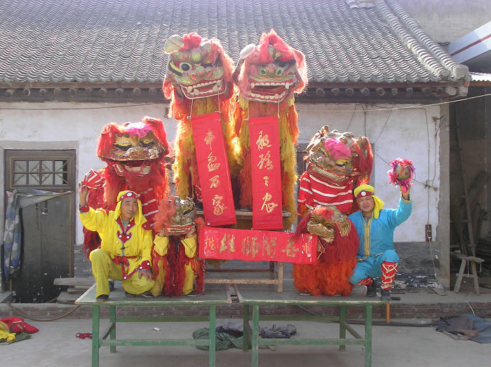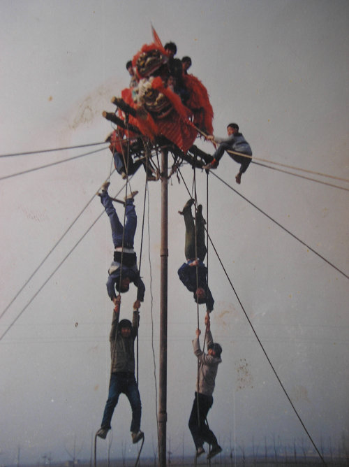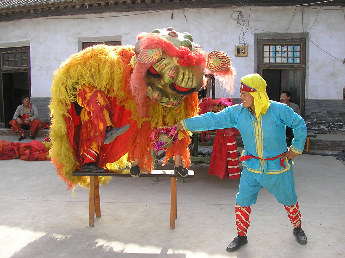 韩城狮舞杂技主要分布于韩城市白家庄村,相传起源于清朝末年,有相对固定的表演流程:(1)开场:雌雄狮子两对,嘴衔礼花、号角,伴随着鼓乐与炮声绕场一周,起到吸引观众的作用。(2)上桌子山:四只狮子从四个方向冲上一个桌面,追逐嬉戏。(3)上凳子山:把凳子交叉摞成5米高的架子,雌雄狮子分别从两边的凳孔中徐徐向上攀爬,最后在顶上互换方向下山。(4)过独木天桥:是把一根4米长的粗圆木支撑到2米高的桥上,两头雄狮分别从两端出发相向而行,相会时一只垫底,一只踩着它的脊背下桥。此外还有翻越梯子山、巧玩花板凳、五子登科、滚绣球、喷火吐青莲、小鬼打架、钻火圈、洞中生子、训狮、群狮秧歌舞、口吐对联等名目。韩城狮舞杂技节目包含了许多高难度的动作,蕴含着先民运用力学与平衡的智慧,是古代科技的重要载体之一,具有重要研究价值。韩城狮舞杂技2008年被列入第一批渭南市非物质文化遗产名录。