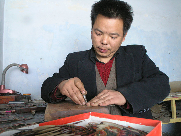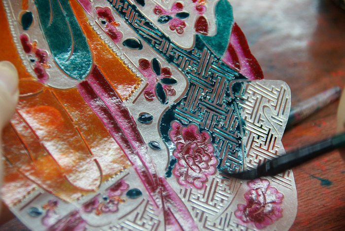 华州皮影制作技艺源于汉代,至今仍以家庭作坊为主的形式生产。华州皮影的制作者手头都收藏有历代艺人做好的图谱,收藏图谱的种类、数量对制作新的皮影具有决定性的影响。华州皮影制作一般选用二至四岁的秦川黄牛皮,经过浸泡、刮洗、阴干、分解后,用湿布潮软,稍加油脂推磨,使牛皮平整光滑,薄而透光。把牛皮覆盖到图谱上,选用钢针扎出轮廓,再运用“推皮过刀”的手法,雕出雏形。华州皮影上色一般用熬好的皮胶加紫铜、银朱、普蓝等天然颜料熔化后染色,要求一笔涂好,避免来回拖动,有时还要用到晕染手法。上色稍干之后,要用熬好的透明皮胶涂抹一遍皮影的两面以固定颜色。接下来要把皮影压平加热,使颜色渗入皮影内部,并挥发其中的水分,以免在使用过程中出现霉变和腐烂现象。最后是把皮影的各部件用线缀结合成,做出成品。成品以侧目单面为主,富有强烈的立体感。华州皮影2010年被列入第二批渭南市非物质文化遗产名录。