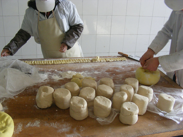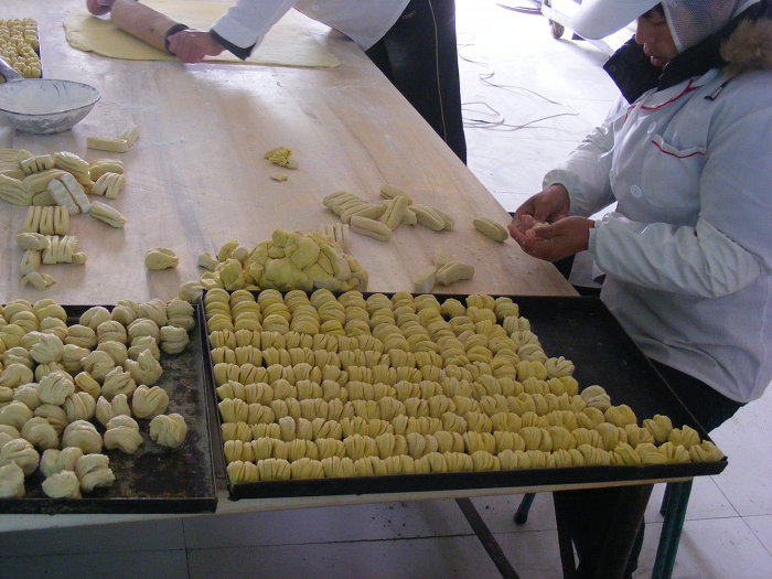 红汇张口饺子是大荔县的一种以酥面作馅的糕点。相传唐朝长乐公主落难,流落到同州沙苑,在路边开了一家店面,出售自制的宫廷糕点。后经一道士指点,灌入枣花蜂蜜,这就是早期的“张口饺子”。红汇张口饺子制作主要有七大工序:一、和面。将面粉、猪油按10:1的比例拌匀,加入少量食用碱、食用橙黄,加温水和成面团。二、制酥。另取面粉、猪油,按2:1的比例拌匀,加苏打和成酥团。三、包酥。把面团和酥团按5:2的比例包裹起来,擀成长条,切成30克左右的小块。四、塑型。像拧螺丝一样,把面块拧成缠绞的形状。五、油炸。先低温50度,后中温100度,最后高温150度,经三遍油炸,发黄后出锅。六、熬糖浆。把水、白糖和蜂蜜按1:2:1的比例搅匀烧开。七、浸泡糖浆。把炸好控干的饺子倒进糖浆锅内,沉底后捞出冷却即可。成品的张口饺子色泽金黄、纹丝分明、酥软清爽,是馈赠亲友的首选之物。红汇张口饺子2010年被列入第二批渭南市非物质文化遗产名录。