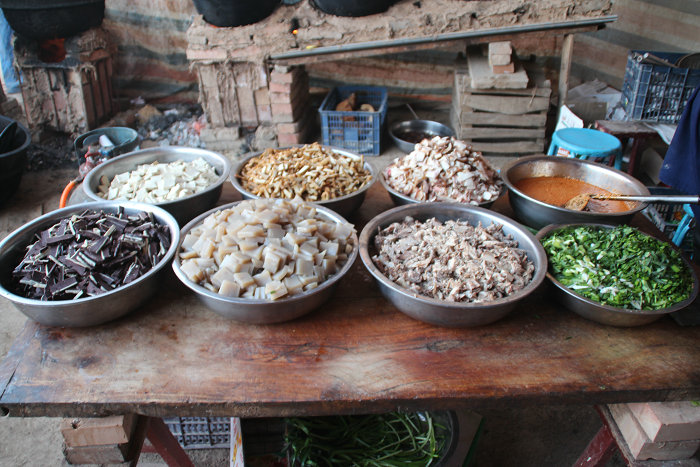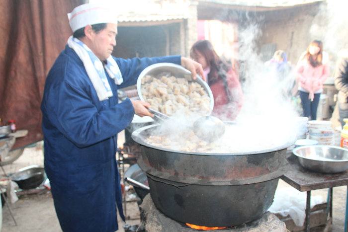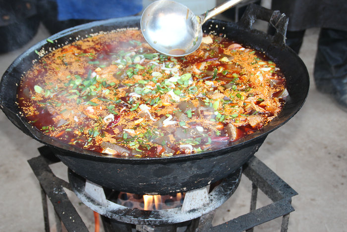 辣子汤是白水民间逢年过节、红白喜事招待必备的特色小吃。其历史可以追溯到二三百年前,起源于史官镇,后传入纵目、北塬、冯塬等地。辣子汤的原料以大麦仁等杂粮为主,后来又加入了凉粉、豆腐、猪血、猪肉等原料。它的制作十分简单,在炒锅内加热肉汤后,放入豆腐块、酱油,翻滚后再放入凉粉、猪油、猪肉、油泼辣子和猪面板(用热猪血和面蒸制而成),煮至汤沸即可。当地人常以辣子汤的可口与否评价主人过事水平的高低,素有“无汤不成席”的谚语,足见辣子汤的地位和影响。辣子汤也传承着白水人崇尚节俭的习俗,更因其制作简便、美味可口而广受欢迎,至今不衰。白水辣子汤2010年被列入第二批渭南市非物质文化遗产名录。