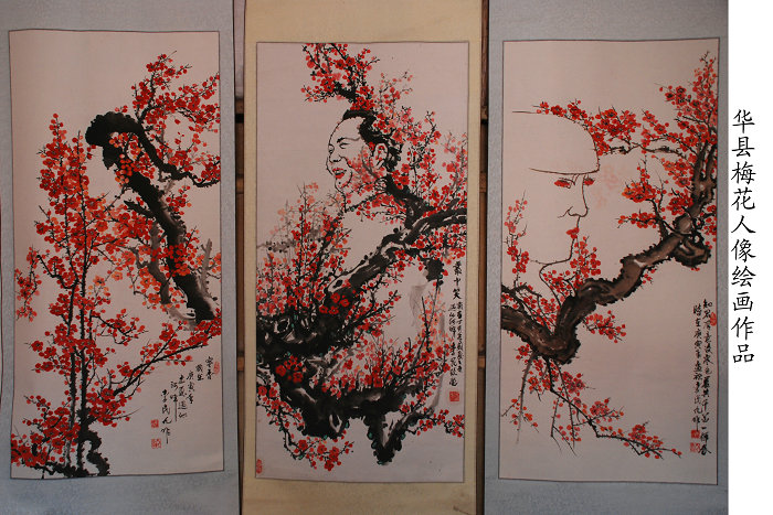 华县梅花人像绘画技艺主要流传于瓜坡镇一带,它产生于清代末年,继承了传统画梅技法的简约、疏朗,同时大胆创新,强调意境,以笔墨传神达意。善于运用梅花和人像组合的场景来凸显思想感情,展示人物精神世界。比如在梅花中画鲁迅,突出他横眉冷对千夫指的傲骨;画伟人毛泽东,显现他在丛中笑的胸怀;画恋人则表现脉脉含情之韵味等等,这种创新得到许多专家学者的认可。作品秦腔角色梅花图曾被西安易俗社收藏。华县梅花人像绘画技艺2010年被列入第二批渭南市非物质文化遗产名录。