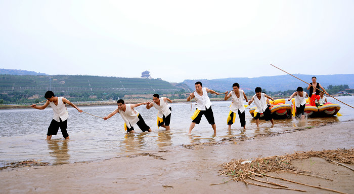 黄河船工号子主要流传于潼关县,起源于何时已不可考,是历代黄河航运的缩影。近代以来由于公路、铁路桥梁的大量修建,黄河船运逐渐衰落,韩城至三门峡航段的大部分船工定居潼关,黄河号子得以在当地传承。潼关黄河船工号子内容丰富,已经整理出来的有十六种。有取名于具体工作的,如起锚号、搭篷号、扬帆号;有取名于劳动时形体特征的,如撑篙时的跌脚号、掉头时的带冲号、到岸时的大跺脚号;有以曲调的节奏取名的,如快的有骑马号、慢的有绵羊号。黄河号子大多采用一领众和的形式,领唱者被称为号头(俗称“艄公”)。劳动强度大的号子几乎只有曲调,如喂喂号只是有节奏的“喂—嗬—喂—嗬”。大部分号子的唱词并不固定,全凭船工自由发挥,“看见啥唱啥,想到哪儿唱到哪儿”。二十世纪九十年代成书的《中国民间音乐集成·陕西卷》收录了部分整理出来的船工号子词曲,这些号子至今还在潼关传唱,显示出很强的艺术生命力。潼关黄河船工号子2013年被列入第三批渭南市非物质文化遗产名录。