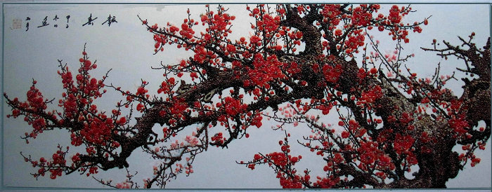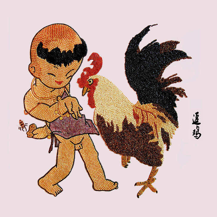 粮食字画是以五谷杂粮颗粒为材料,以山水、花鸟、人物为题材的一种特殊书画艺术,流传于华县等地。据传起源于隋末唐初的“豆粘字”和“豆粘画”,至今已有1400多年的历史。制作字画前,须将粮食颗粒进行筛选、浸泡、熏蒸、烘烤、风干、晾晒、阴干等多道工序处理,以防虫防腐,同时保证画品颜色之鲜亮。制作时,先在硬质纸板上用粗线条勾勒底稿,抹上胶水,根据预先想好的图案构成选择适当颜色和大小的粮食颗粒,用镊子夹到纸板上,然后用竹签拨动到恰当的位置,最后用薄木板压平,晾干之后装框。粮食字画以构图、仿形、色彩明暗选配的临摹手法粘贴而成,完工的作品庄重大气,色彩鲜明,细部排列出自然天成的纹理,全局爽朗疏阔,以整体的形意取胜,富有农家的审美情趣。粮食字画的工艺技法有绘有塑,将“物质食粮”和“精神食粮”相结合,闪耀着劳动者智慧的光辉。华州粮食字画2013年被列入第三批渭南市非物质文化遗产名录。
