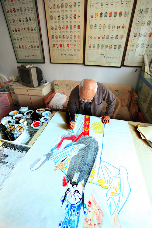 秦腔脸谱是演员脸上的绘画,用于舞台演出时的化妆造型艺术,肇端于陕西关中,广泛流行于西北各地。远古时代人们佩戴面具的傩戏表演是其雏形。唐代开始用粉墨、油彩等颜料直接在脸上勾画。关中秦腔脸谱绘制名人辈出,明代前七子之一、著名文学家康海所创作的130幅脸谱作品流传至今。清代的大净四斤儿、李有儿、李桐轩、李约祉等人以完整的谱系传承着秦腔脸谱的绘制技艺。秦腔脸谱有红、紫、黑白、蓝、绿、黄、粉红、瓦灰、蟹青、赭色、金、银等颜色。如红色描绘出人物忠勇性烈,黑色描绘刚毅正直,白色描绘奸诈狠毒,银色描绘神怪,金色描绘仙佛等。从整体构成来看脸谱可以分为整脸、三块瓦脸、十字门脸、歪脸、侩脸、道士脸、太监脸、神佛脸、文丑脸、武丑脸等。十分注重眼窝、嘴岔、脑门细部的刻画。脸谱主要用于妆扮秦腔等传统戏剧的净角(大花脸),也可用作木偶戏和芯子、旱马、旱船等社火扮演者的脸部勾勒。其首要作用是使观众根据脸谱来迅速判断人物角色,同时也是一种独立的审美元素。秦腔脸谱2013年被列入第三批渭南市非物质文化遗产名录。