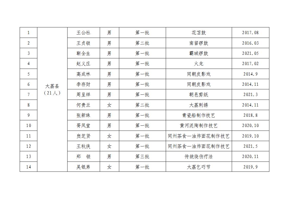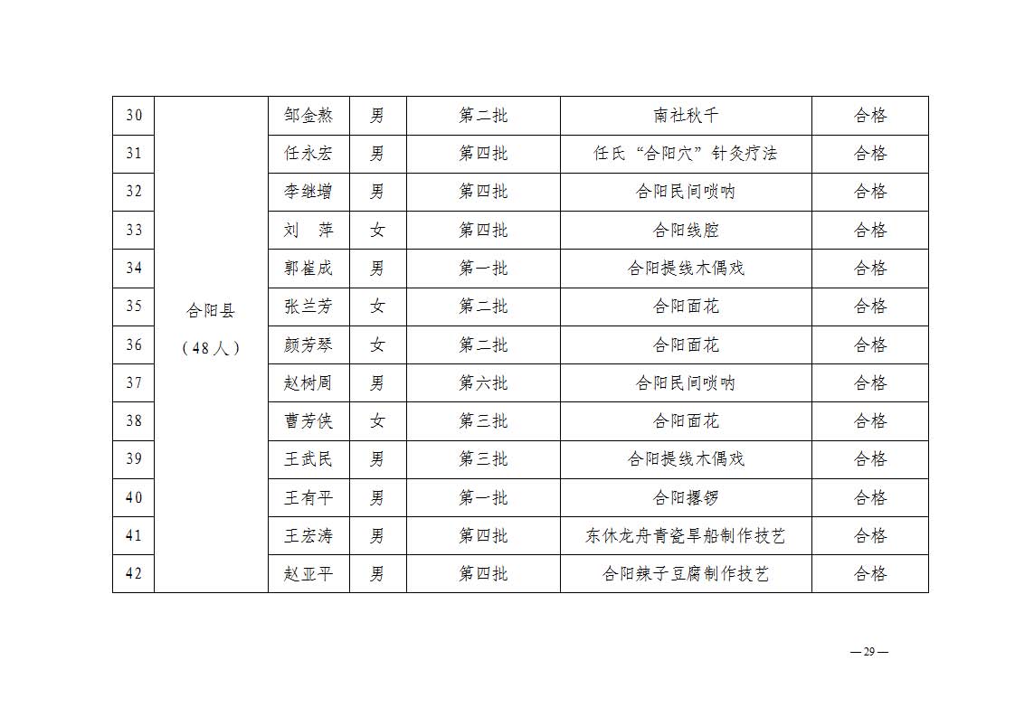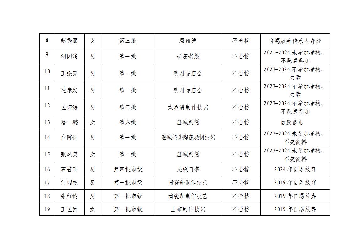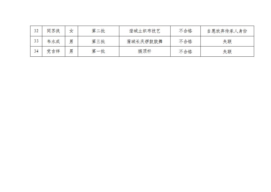 2. 依据《中华人民共和国非物质文化遗产法》《陕西省非物质文化遗产条例》及《渭南市市级传承人认定与管理办法》第十四条规定,拟对考核不合格的34名传承人暂停发放传习补助费用。