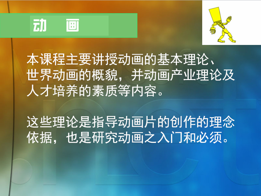 本课程主要讲授动画的基本理论、世界动画的概貌,并动画产业理论及人才培养的素质等内容。