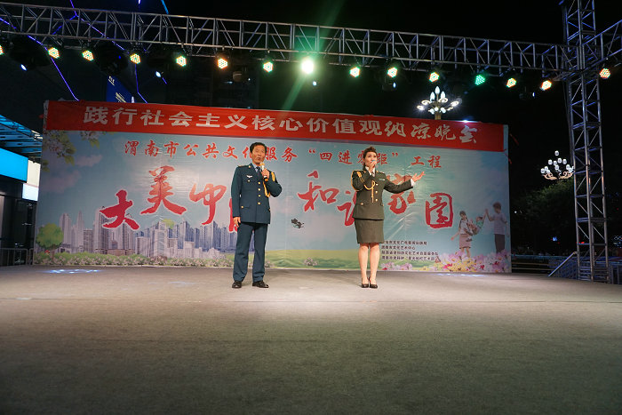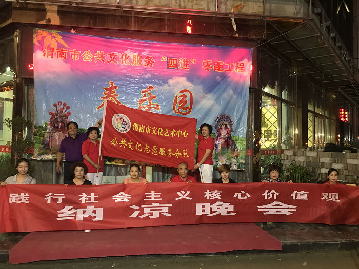 8月14日至8月17日由渭南市文化广电新闻出版局主办,渭南市文化艺术中心承办的“践行社会主义核心价值观” 纳凉晚会走进了中心广场、槐衙社区、新洲国际、西二路北段。